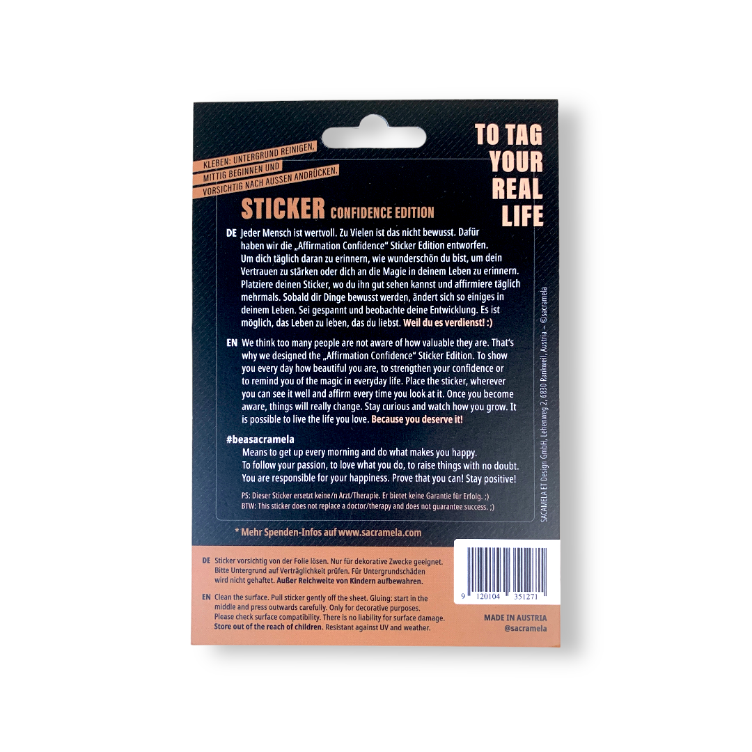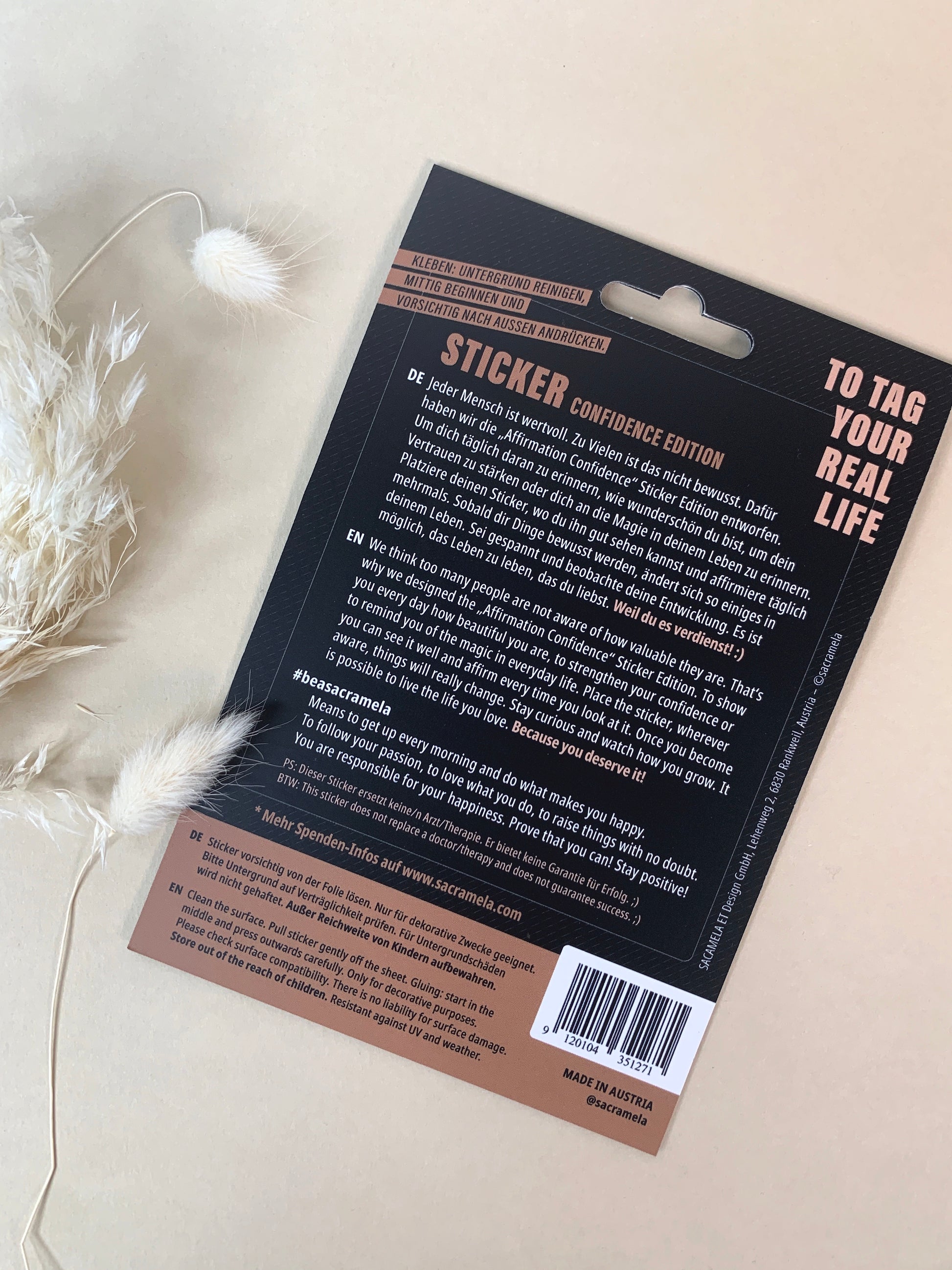 Jeder Mensch ist wertvoll. Zu Vielen ist das nicht bewusst. Dafür haben wir die „Affirmation Confidence“ Sticker Edition entworfen. Um dich täglich daran zu erinnern, wie wunderschön du bist, um dein Vertrauen zu stärken oder dich an die Magie in deinem Leben zu erinnern.