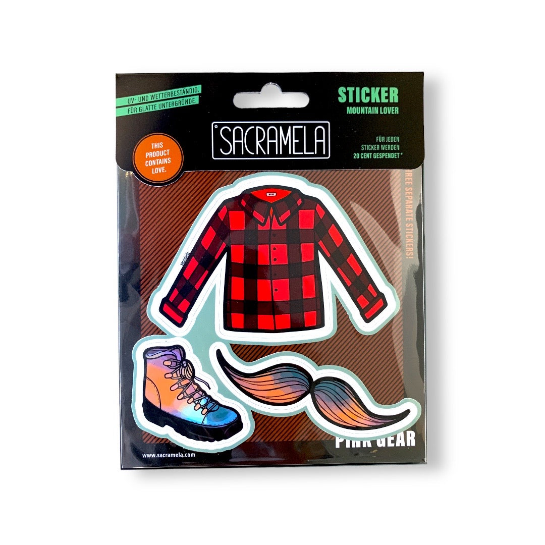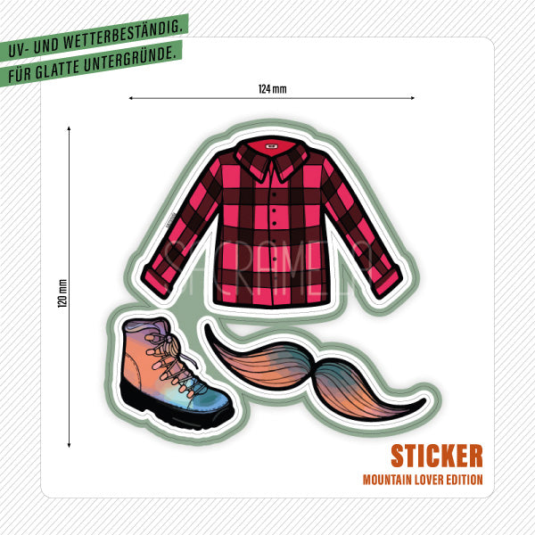 3 bunte, wetter- und UV-beständige Mountain Lover Aufkleber auf einem Sheet.